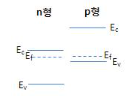 페르미 함수 f(E) 는 간단히 말하자면 에너지 E에서 존재하고 있는 준위들이 얼마나 많은 전자로써 채워지는가를 말합니다. ntype과 ptype의 페르미 준위를 보겠습니다. 페르미 준위는 E=페르미 준위 일때 f(Ef)=1/2 인 지점을 이야기합니다.